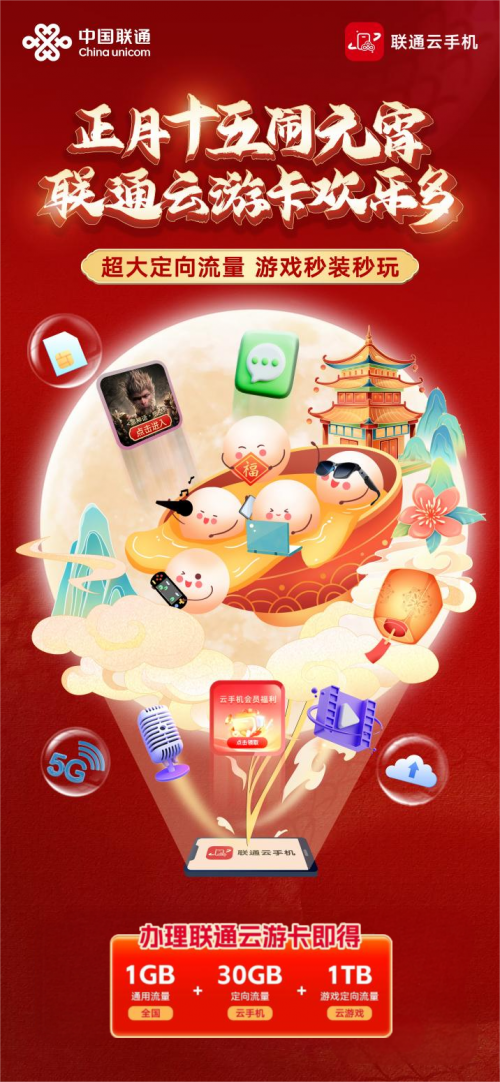 联通云游卡携元宵专属惊喜登场。办理即得1GB全国通用流量、30GB云手机定向流量和1TB云游戏定向流量。畅享超大定向流量,游戏秒装秒玩,摆脱卡顿束缚。这个元宵,让联通云游卡陪你尽情嗨玩,扫描海报二维码速办,开启畅爽云游之旅!