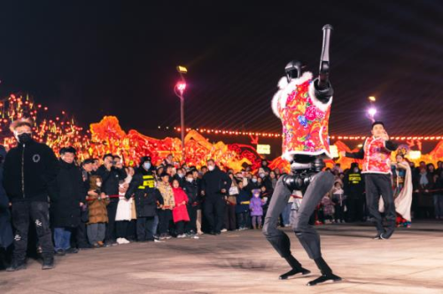 现代科技联动非遗文化,映照创新传承的璀璨华章。今年登上中央电视台春节联欢晚会的智能人形机器人来到2025唐山南湖春节灯会现场,与传统舞狮实现古今交融的梦幻联动。身着喜庆服饰的智能人形机器人与舞狮演员们默契配合,上演充满创意的惊艳舞蹈。精准流畅的动作,步伐与鼓点的完美契合,让硬核科技与传统文化碰撞出了独特的魅力,赢得现场观众如潮般的喝彩。