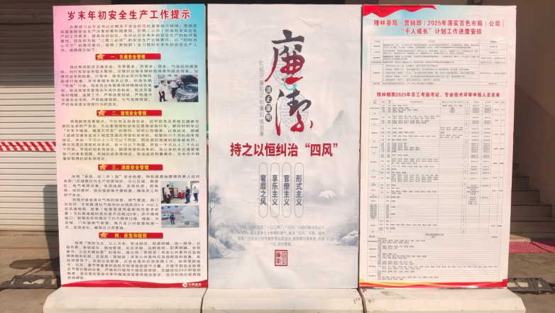 在全面从严治党的时代浪潮中,廉政建设已然成为各单位稳健前行的基石与保障。百色市隆林县局(营销部)深刻洞察这一时代要义,将廉政建设作为推动单位发展、塑造良好形象的关键举措,坚定不移地走在廉政建设的探索与实践之路上。从强化内部管理到营造廉洁文化氛围,从筑牢思想防线到严格行为规范,每一个环节都凝聚着隆林县局(营销部)对廉政建设的执着与坚守,致力于为单位发展注入源源不断的“廉动力”,在新时代的征程中书写属于自己的廉政篇章。
