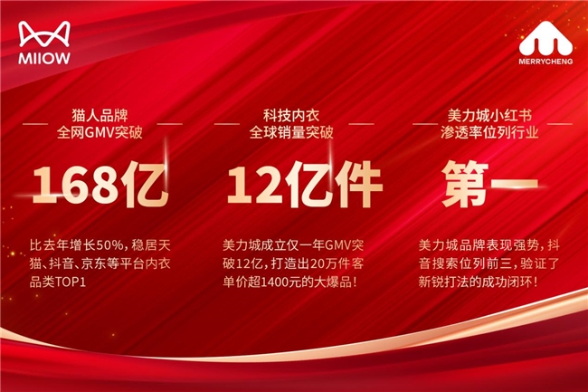 2024年,猫人集团交出一份亮眼答卷:猫人品牌全网GMV突破168亿,比去年增长50%,稳居天猫、抖音、京东等平台内衣品类TOP1,科技内衣全球销量突破12亿件。
