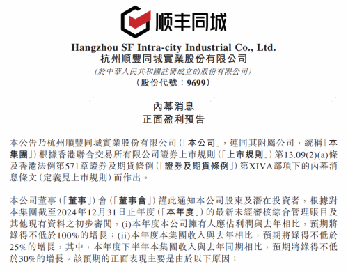 数字不会说谎,根据艾瑞咨询报告,2023年即时配送行业规模约为3410亿元,相较2018年的1168亿元增长显著,五年间复合增速高达23.9%。市场不断向好的同时,顺丰同城继2023年率先行业扭亏为盈成为“即时物流盈利第一股”后,2024年继续发布正面盈利预告显示全年净利润同比增长不低于100%,全年收入同比增长不低于25%,大幅领跑其他玩家。