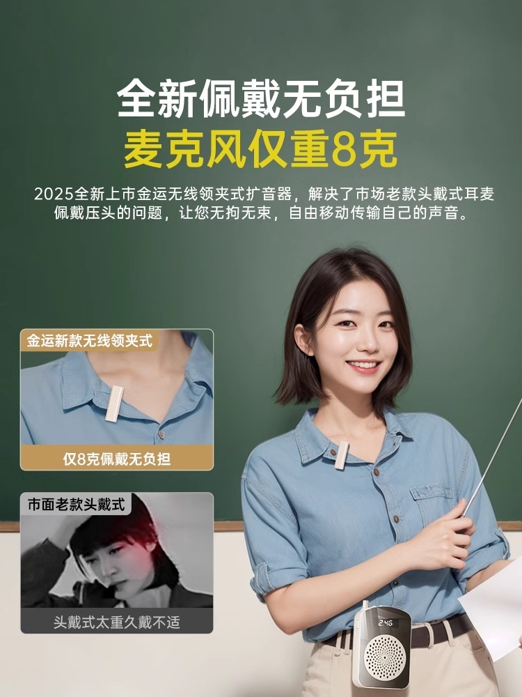 传统头戴式扩音器因重量大、久戴压迫头部等问题饱受诟病。金运M10扩音器创新采用领夹式无线结构,机身仅重8克(约一枚硬币重量),搭配隐形背夹设计,可灵活固定于衣领、口袋或背包带,彻底摆脱头戴设备的沉重感。无论是教师全天授课、导游长时间讲解,还是直播达人多场景切换,M10均能实现“无感佩戴”,让声音传递更自由。