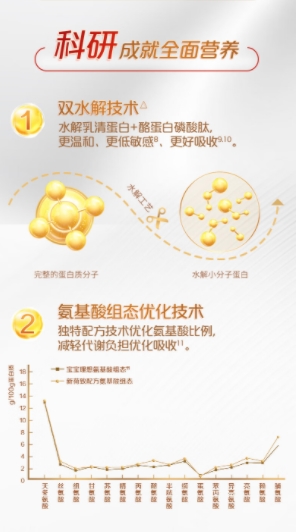 此外,5重全面自护营养中结构脂OPO的特别添加,优化了脂肪与钙质的吸收路径,促进了脂肪与钙质的吸收,对骨骼强健非常有益。最后,双水解小分子(水解蛋白+CPP),小分子易吸收,大大降低了过敏风险,并有效促进了钙、铁、锌等关键矿物质的吸收与利用,为宝宝的健康成长奠定了坚实的营养基础。5重全面自护营养,缺一不可,能够更好地助力宝宝全面自护力提升,打好体质基础,赢在起跑线上。