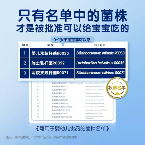 合生元益生菌冲剂儿童型所含的主要菌株为婴儿双歧杆菌R0033源自婴儿肠道,与儿童肠道中的菌群高度契合,吸收效率更高,能够更好地发挥作用。另外,合生元益生菌冲剂儿童型所含的婴儿双歧杆菌R0033、两歧双歧杆菌R0071和瑞士乳杆菌R0052,均来自国家卫健委《可用于婴幼儿食品的菌种名单》,安全性经过充分验证。