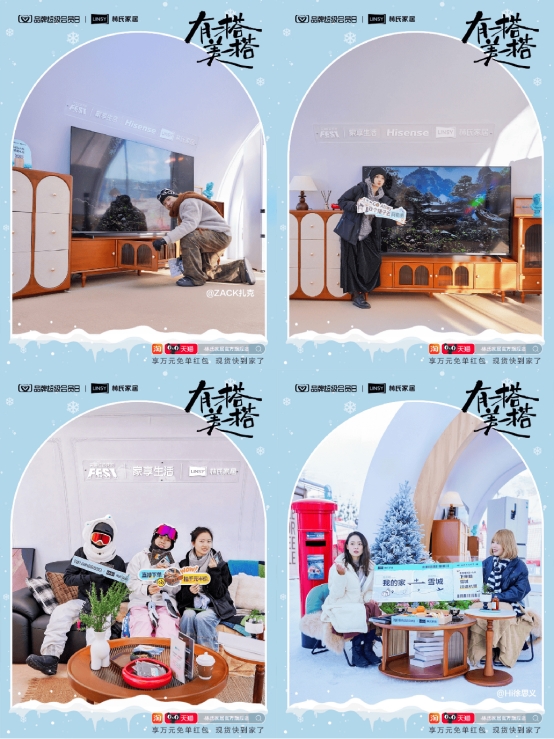 所以,当阿勒泰遇到冰雪经济,双重BUFF叠加也为品牌营销创造出得天独厚的流量条件。为了承接冰雪热潮带来的高人气,2024年12月13-15日,“林氏家居X天猫品牌超级会员日”在阿勒泰开展了一场线下雪景派对活动,成功切中冰雪经济“热”潮涌动下的年轻人热爱。作为唯一受邀参加该活动的家居品牌,林氏家居带来品牌第一套混搭风格的VE套系产品,将典雅的法式复古与精致的奶油风融于冰天雪地之间,在一成不变的皑皑雪景中以混搭风凸显反差感,助力品牌在这波冰雪营销中 “赢麻了”。