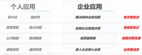 虽然AI在C端和B端都有广泛应用,然而,两者对AI的使用要求却存在巨大差异。C端应用更注重便捷性、通用性和临时性,而B端应用则更关注可靠性、合规性以及与业务的深度融合。