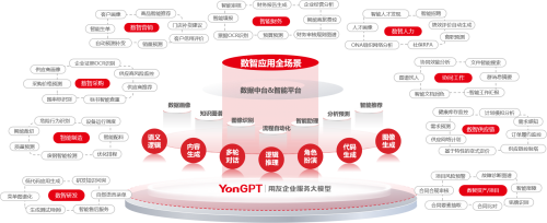 用友YonSuite以AI为核心驱动力,通过大模型(如YonGPT、DeepSeek系列)和开放生态整合,构建了企业级智能底座,实现了包括人力、财务、营销、采购、协同等企业经营管理全域的智能化。