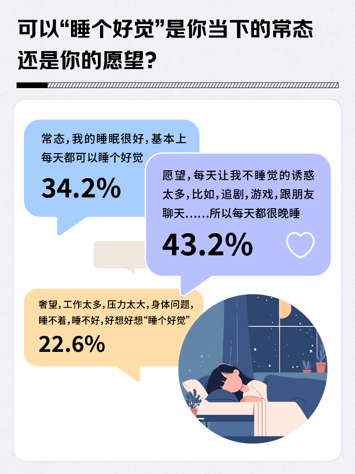 习惯性熬夜晚睡、白天易疲惫困乏、睡眠浅易惊醒、夜里醒后难入睡、入睡困难……因工作压力、生活压力、个人情绪等各种原因,越来越多人正在面临睡眠问题。在调研中,43.2%的人表示“睡个好觉”是一种愿望,“每天让我不睡觉的诱惑太多,比如追剧、游戏、跟朋友聊天……所以每天都很晚睡”,还有22.6%的人认为是一种奢望,“工作太多,压力太大,身体问题,睡不着,睡不好,好想好想睡个好觉”。