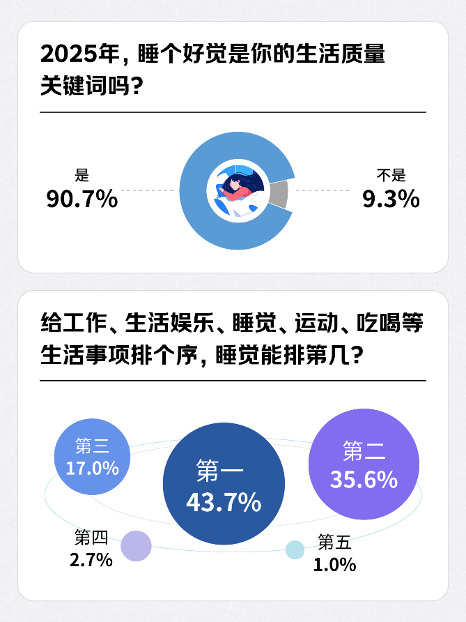 “睡个好觉”成为大家普遍诉求。调研显示,2025年生活质量关键词,九成人选择“睡个好觉”。如果给工作、生活娱乐、睡觉、运动、吃喝等生活事项排个序,超四成人将睡觉排在第一位,35.6%的人将睡觉排在第二位。“睡不好,一切都像蒙了层灰。”一位受访者的留言道出群体心声。