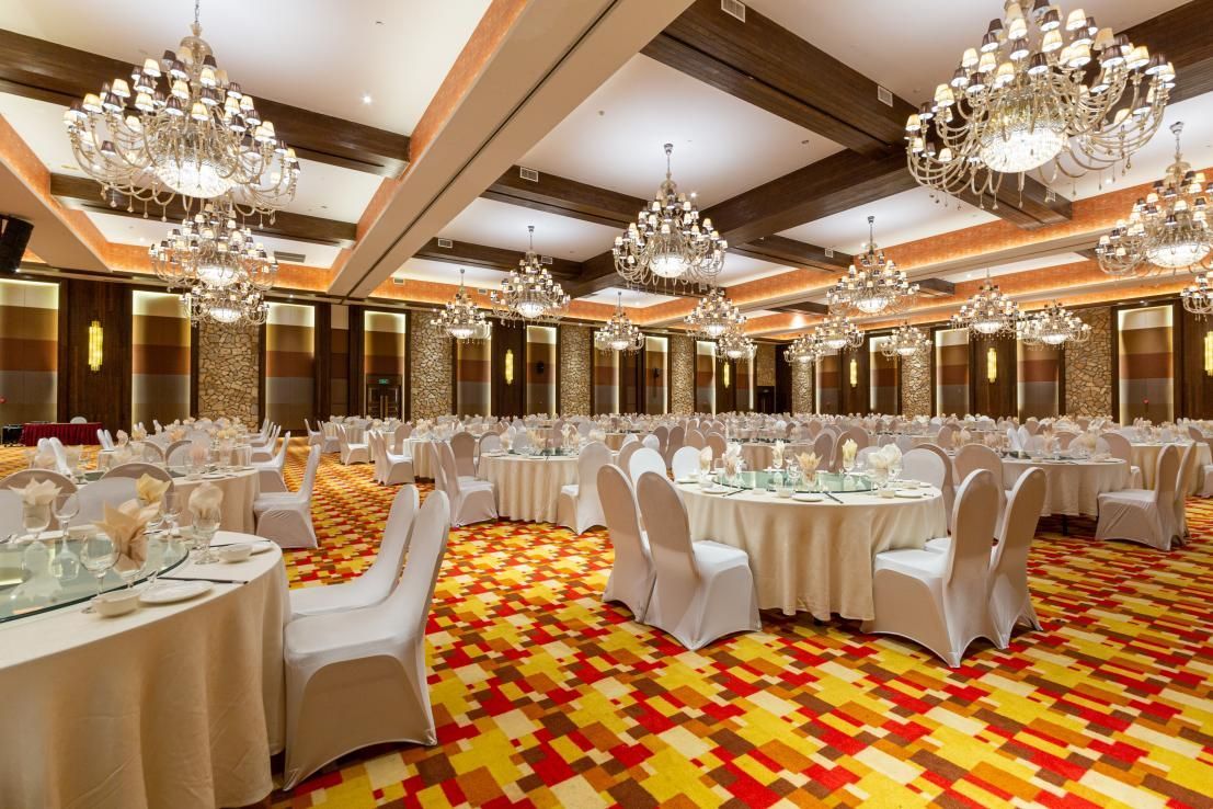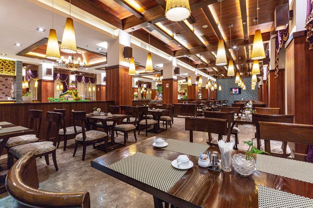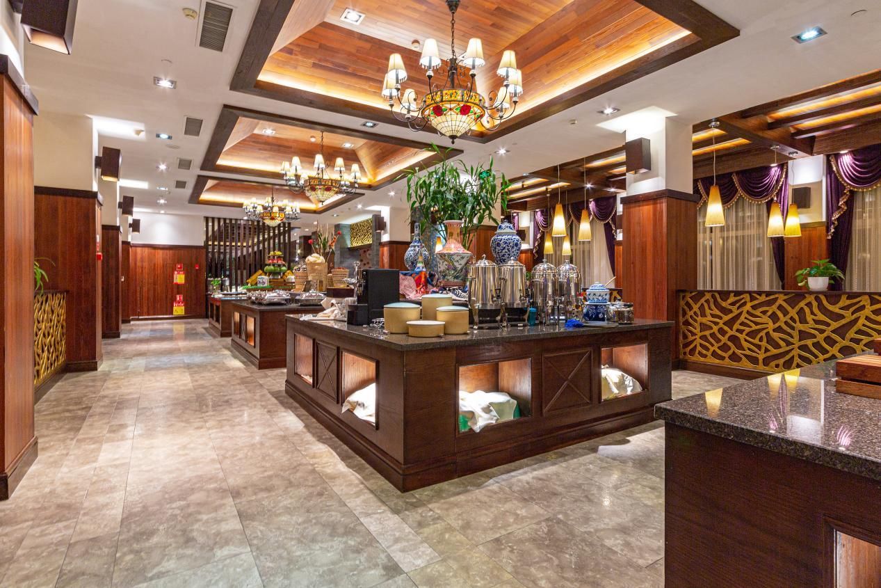 酒店西餐厅可容纳200人,宴会中心可容纳800人同时就餐,提供八菜一汤自助餐,以清淡营养为特色,食材选用自有种植基地有机无公害蔬菜。