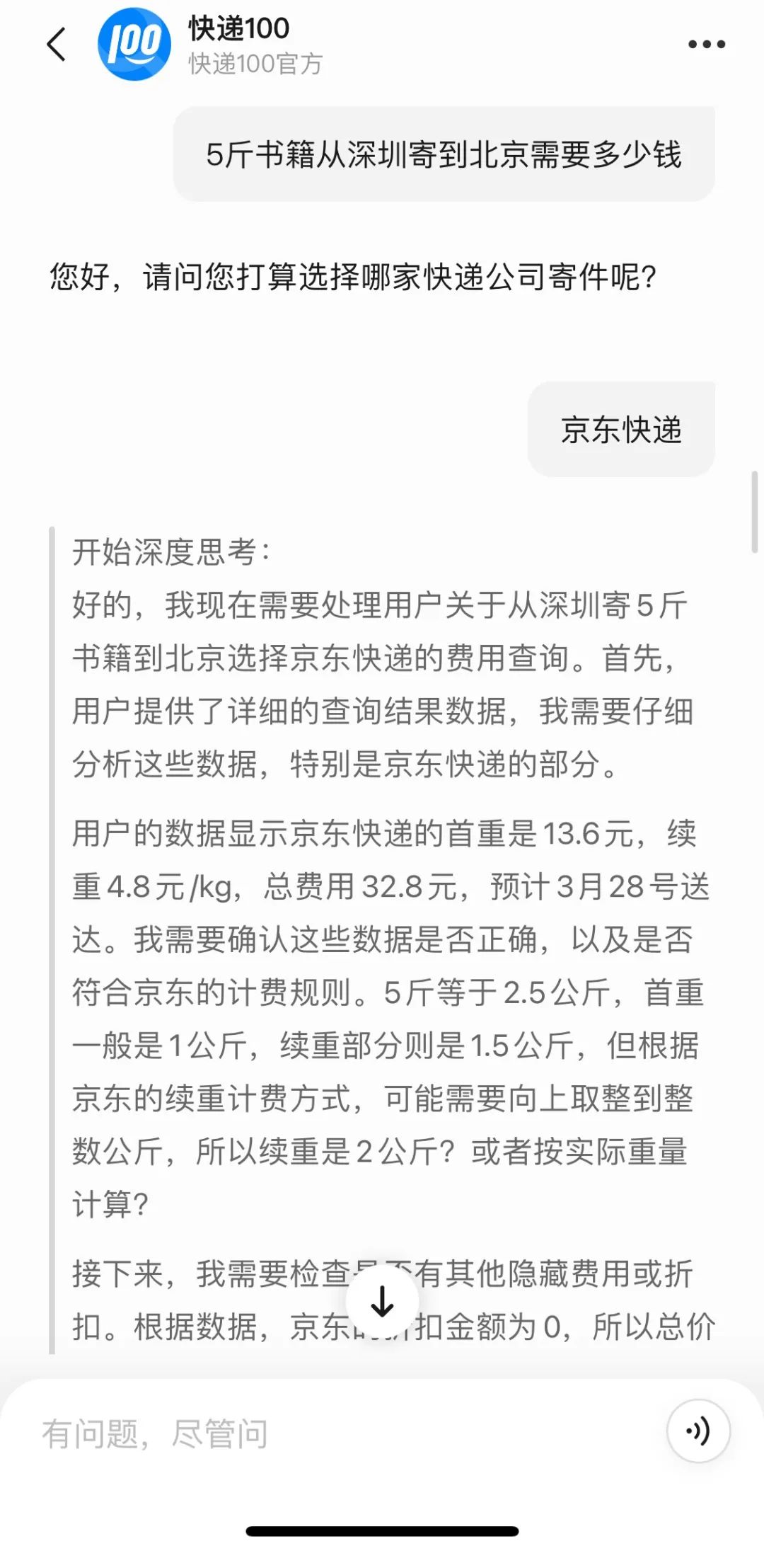 能从显性输入中推理隐性需求(如情绪状态、潜在意图),并基于知识图谱和个性化画像生成共情式回应,是DeepSeek R1令人十分震惊的表现,这一特性也使得与满血版R1结合的腾讯元宝有读心术之感。(未来,一旦混元T1面向C端用户,结合腾讯自由有社交生态,大模型成为读心专家指日可待。)而仿佛拥有读心术般的察言观色能力,其实现阶段便已经在快递100智能体上得到充分体现。在此前,用户输入始发地、目的地以及包裹重量等细节后,快递100智能体将自动计算并展示预计的运输费用。但现在得益于大模型的深度思考能力,在腾讯元宝上,快递100智能体不仅能分析用户的真实意图,还会根据用户的实际情况进行智能化的推荐。例如,当问到5斤的书籍从深圳寄到北京需要多少钱时,快递100智能体并不会像以往一样快速给出答案,而是进一步互动提问询问用户具体想寄哪个快递。