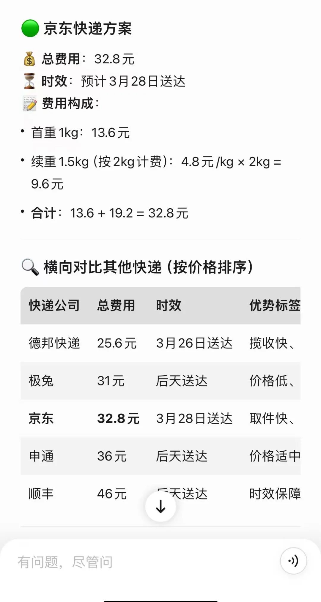 值得一提是,单一的快递公司只能提供其自身平台的信息,而快递100智能体则聚合了2100家快递物流公司的信息,这使得它的领域知识库语料丰富,能够天然地为客户提供比价等服务。