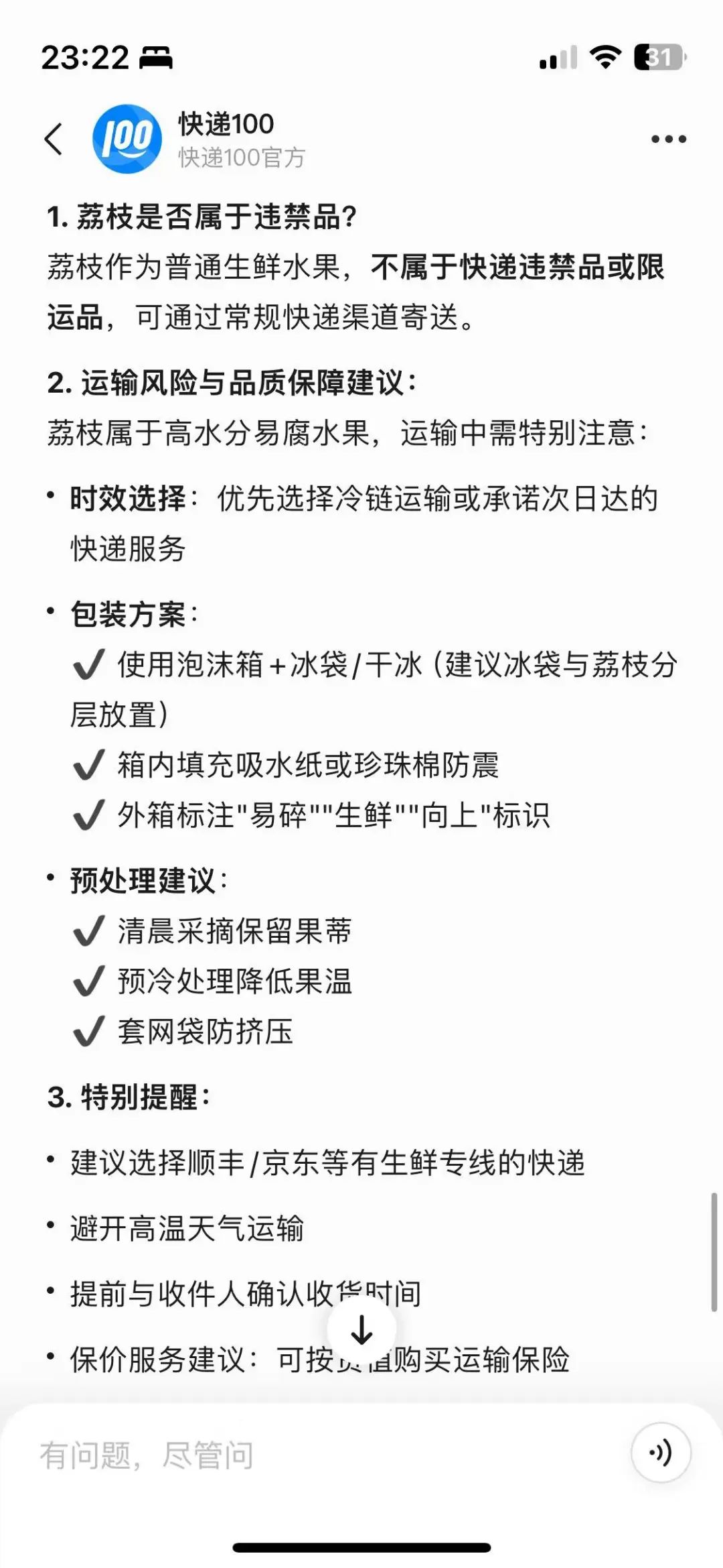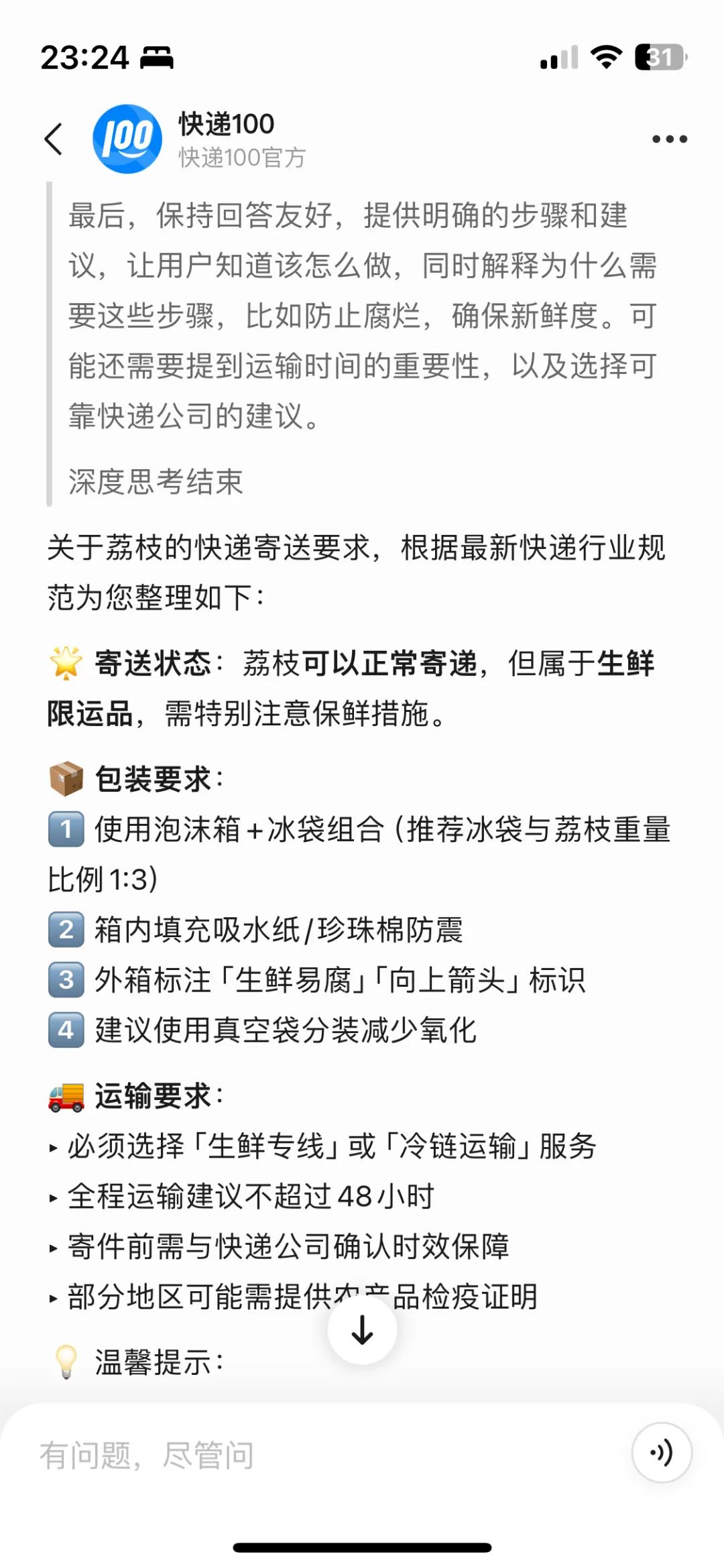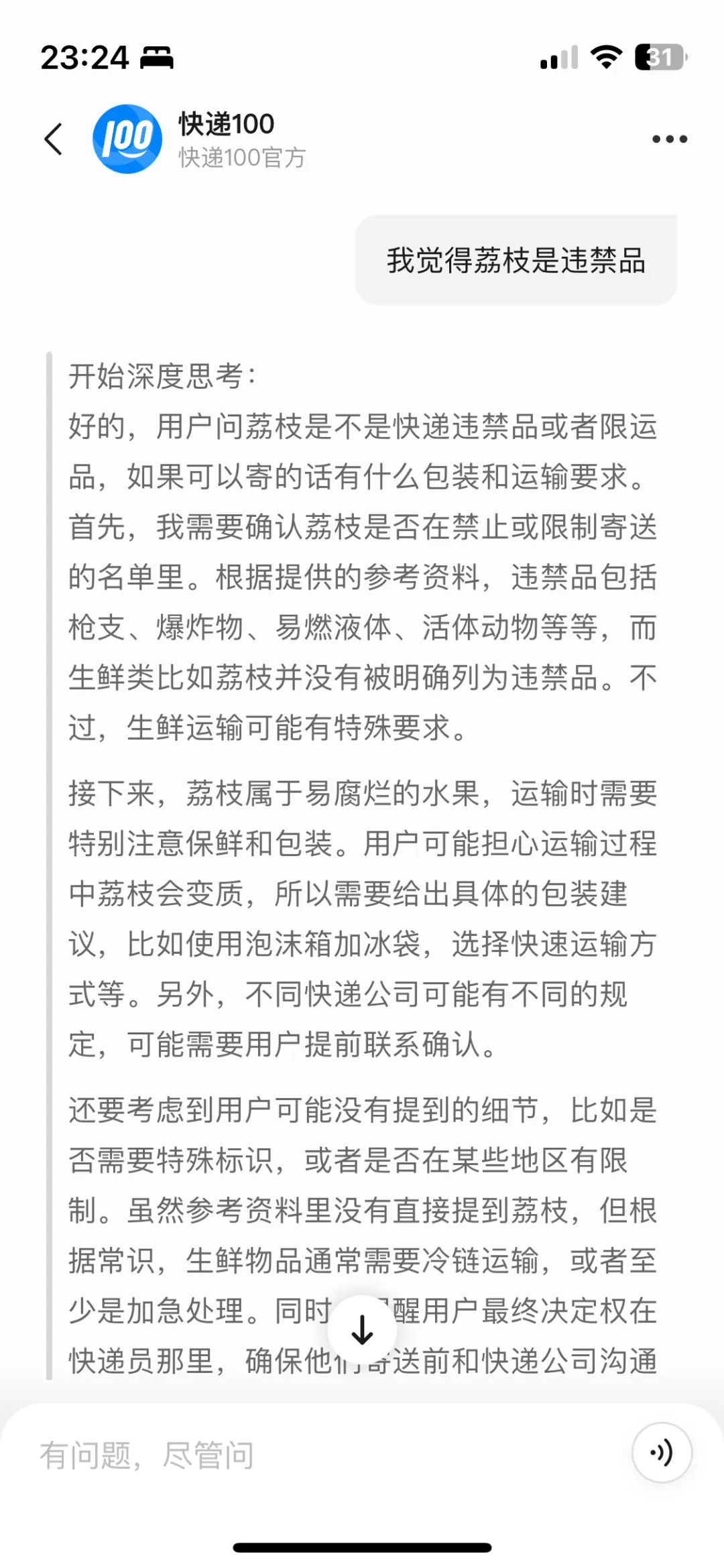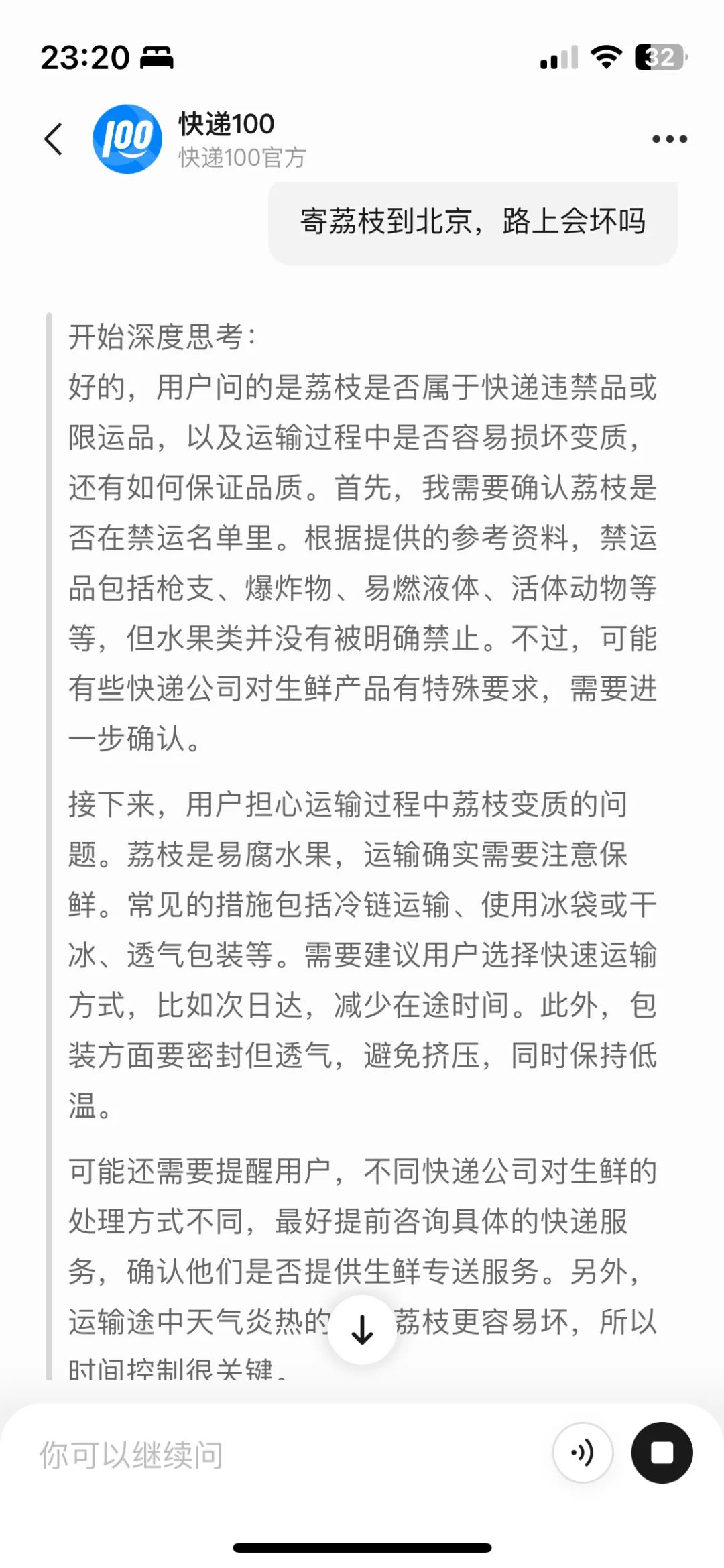 而现如今,当用户询问,“寄荔枝到北京,路上会坏吗?”这一模糊性问题时,快递100智能体能识别出,用户在进行违禁品查询,并给出了自己的深度思考和回答。