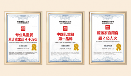 西贝其实一直都是这个赛道的专业选手。今年1月,尚普咨询集团向内蒙古西贝餐饮集团有限公司(以下简称“西贝”)颁发了市场地位证明书——“西贝XIBEI,中国儿童餐第一品牌”,连同去年11月颁发的“专业儿童餐累计卖出超4000万份”、“服务家庭顾客超2亿人次”权威证明,三项重磅认证,让这个37年的餐饮品牌重新成为了行业焦点。