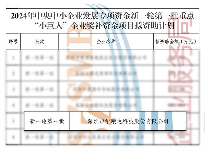 近日,经财政部、工业和信息化部多轮严格评审与联合复审,深圳市公示了2024年中央中小企业发展专项资金新一轮第一批重点“小巨人”企业名单,华曦达成功入选。这一荣誉不仅是对华曦达深耕行业、持续创新的高度认可,更标志着华曦达获评国家级专精特新“小巨人”企业后,再次迈上新台阶,成功跻身重点“小巨人”企业行列。