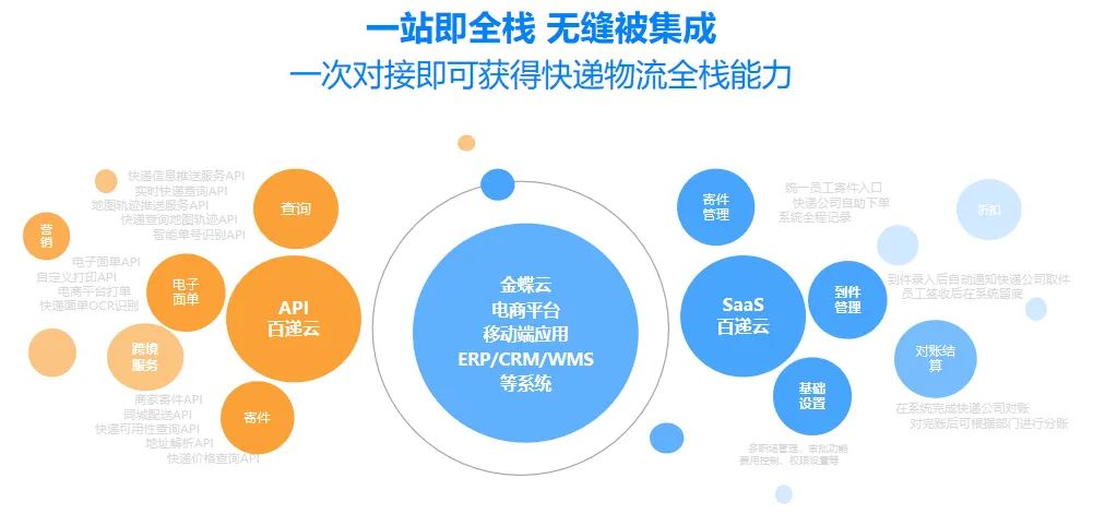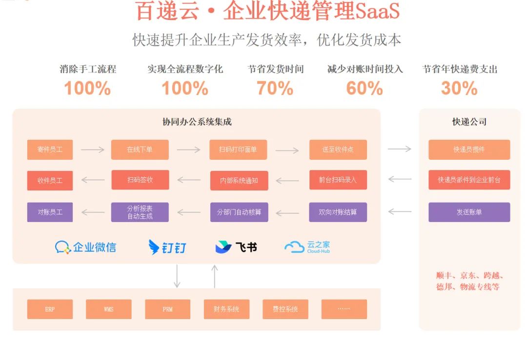 “SaaS+API一体化组合解决方案”, 将「百递云·企业快递管理SaaS」接入企业协同办公平台(企微/飞书/云之家等),将「百递云·API开放平台」与企业ERP/WMS/CRM/客服系统等内部管理系统集成,构建内外一体化集成的企业快递物流管理系统。