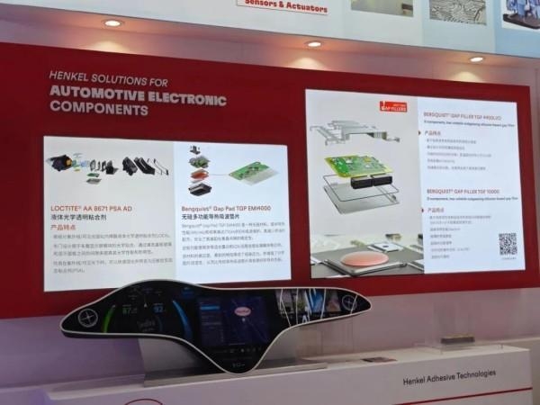 汉高重点展示了其面向汽车电子的一系列创新材料。例如其 LOCTITE® AA 8671 PSA AD 液体光学透明粘合剂,专为车载显示屏模组的光学贴合设计,通过紫外/可见光快速固化,提升光学性能和耐用性。在热管理与电磁兼容方面,汉高带来了 Bergquist® Gap Pad TGP EMI4000,这是一款无硅导热垫片,不仅提供4W/mK的导热性能,还能在高频段(达77GHz)提供EMI吸波保护,特别适用于雷达和V2X通信模块。针对不同的散热需求,汉高还展出了两款低挥发性有机硅导热填缝剂:BERGQUIST® GAP FILLER TGF 4400LVO (4.4W/mK,适用于薄间隙填充) 和具备超高导热性能的 BERGQUIST® GAP FILLER TGF 10000 (高达10W/mK,适用于高性能散热场景,且点胶速度快)。