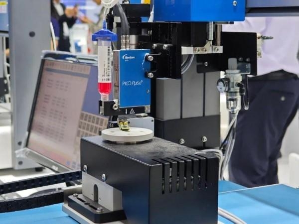 同样专注于精密流体控制的武藏展示了其从点胶设备到喷嘴耗材均自主研发的技术实力。其高精度点胶机专为半导体、显示器、手机等高科技产品中的微量点胶而设计。值得关注的是其新推出的 MPP-5-GF柱塞阀,该阀门设计巧妙,能够有效应对新能源汽车、ADAS等领域常用的高粘度、高填充导热材料,应对了传统设备易损坏、难清洁的难点,有助于实现微量、精密、高速的填充。此外,武藏还展示了具备 工业4.0可追溯性 功能的新型点胶机 SuperΣCM4,通过以太网实现网络化管理,助力客户生产管理。