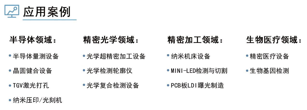 公司现已在半导体精密运动控制、晶圆移载以及半导体核心部件的开发中累计申报发明专利、实用新型专利、软件著作权等数十余项,不断实现高新技术的科技成果转化。公司对未来超精密应用场景进行了精准且长期的规划,并建立了先进的纳米级实验室及完善的研发生产体系,构筑技术壁垒,打造全球领先的纳米级高精度产品,相关产品广泛应用于半导体/精密光学/军工/精密机床/生物医疗等诸多领域。