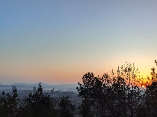 一口气登到山顶,整个城区的景色尽收眼底,远处起起伏伏的山峦,在晨光中仿似被暮色印染,青墨色的轮廓在晨雾中深浅不一、朦朦胧胧,仿似一幅山水画。那橙红色的小球已然升至半空,变得耀眼夺目,鸟儿们在林间跳跃,叽叽喳喳的声音此起彼伏,暮色消退,站在山顶,任凭清晨的风轻轻拂过脸颊,身上的热意一下子散了开来,整个人也神清气爽了,远处山峦的轮廓越发清晰,公路上车辆行人络绎不绝。整座山仿似苏醒了,整个小城也苏醒了……(撰稿人:刘玉芬)