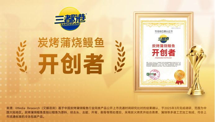 2025年3月,三都港获全球新经济产业第三方数据挖掘和分析机构iiMedia Research(艾媒咨询)授予的“炭烤蒲烧鳗鱼开创者”市场地位确认。