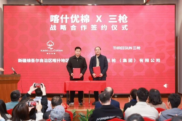 “喀什优棉”,是喀什地区优质棉花的公共品牌,由上海援疆会同上海纺织时尚产业发展有限公司、东华大学、川月农业等沪喀两地棉纺织产业链重要力量,于2024年制定实施“喀什优棉”品牌建设推广计划,以品牌建设为抓手,以市场需求为引领,鼓励和规范棉花科学种植和生产加工,逐步实现用品牌构建和深耕“从田头到衣柜”的棉纺全产业链价值。2024年10月,“喀什优棉”携手高级时装品牌“JUDYHUA”在2025春夏上海时装周成功首秀,并发布“喀什优棉”团体标准,迈出了品牌化、产业化发展的重要一步。2025年和三枪的产品合作,更是提高了“喀什优棉”品牌在终端市场的产品多样化和可塑性,同时也是作为新疆棉花的品牌化发展先行者,率先讲好新疆棉故事,展示新疆棉形象,促进新疆棉高质量发展。