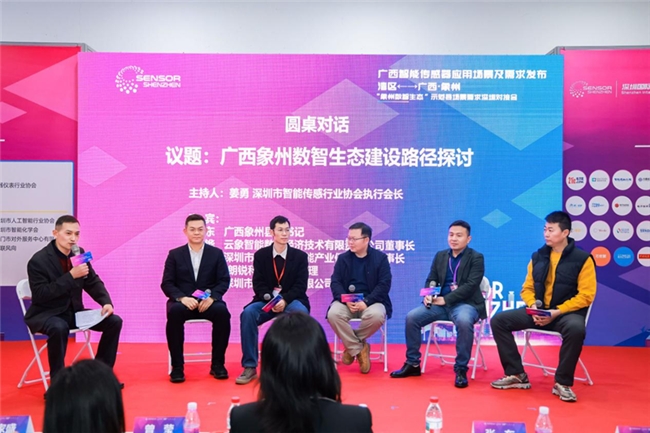 圆桌对话环节,主持人深圳市智能传感行业协会执行会长姜勇与象州县委书记张东、云象智能董事长黄铧、深圳市畅想人工智能产业促进中心理事长胡博、朗锐科技集团总经理肖维龙、谷德科技总经理徐超等嘉宾,从政府、数字经济、人工智能、工业视觉及低空经济、传感器领域和视角,就广西象州数智生态建设路径展开深入的交流探讨。