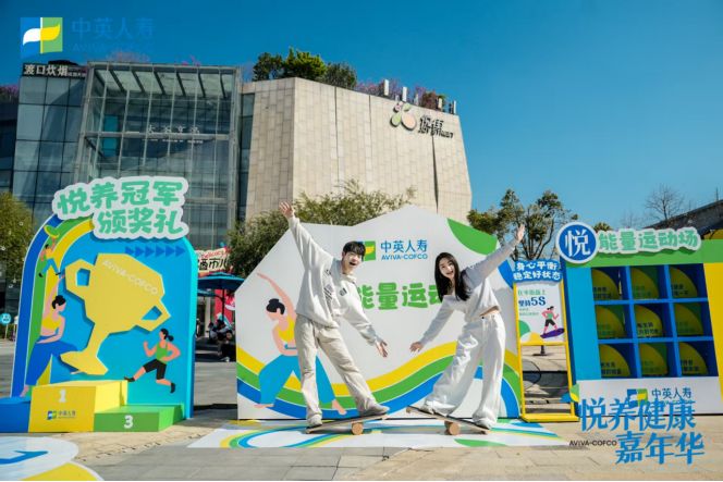 知名健身达人空降嘉年华现场带练“悦养健康操”,将健康气氛渲染到现场的每个角落;在“悦·能量运动场”,现场来宾可通过“健康起飞”飞盘挑战和"身心平衡体感挑战游戏,在趣味运动中激活身体潜能;“养·健康生活站”为人们提供免费健康检测服务,通过中医脉诊、鹰瞳检测、脑健康检测及手持心电检测,为日常健康管理保驾护航。此外,墙面暗藏“身·心·财”三维度有机结合的健康知识彩蛋,让"养健康”的知识触手可及;“冠军打卡点”特别设计悦养健康操动作拍照装置和冠军领奖台,吸引现场来宾合影打卡。