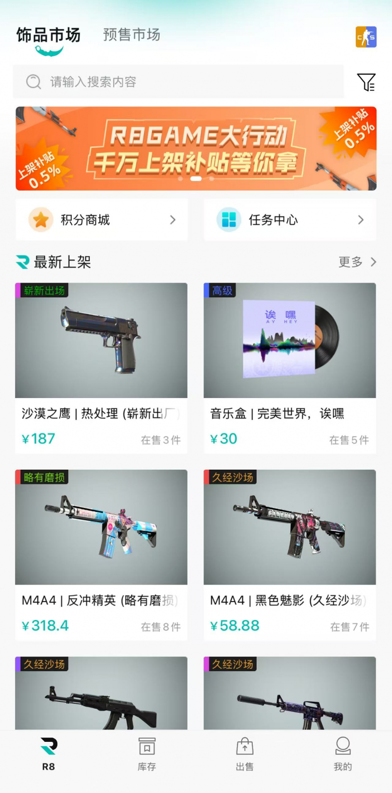 在R8GAME上架饰品24小时未售出且店铺未离线,即可获得上架价格0.5%的活动补贴。上架就拿补贴?比出租还划算!