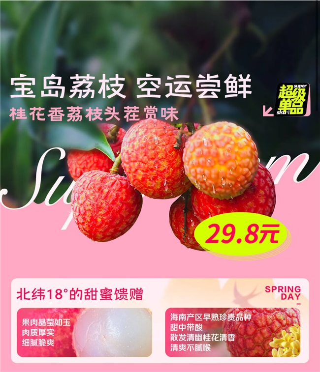 为破解荔枝“一日色变、三日味改”的保鲜难题,京东七鲜采用“全程冷链+空运直达”组合方案,通过供应链优势,24小时产地直达,以最优品质、最快速度让消费者品尝最时令的海南荔枝,尝鲜装300g的价格为29.8元。
