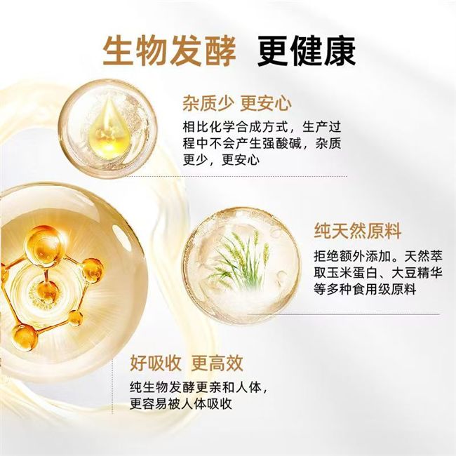 采用生物发酵方式生产,天然萃取玉米蛋白、大豆精华等多种食用级原料,更亲和人体,更易吸收;相比化学合成方式,在生成过程中不产生强酸碱,杂质更少;