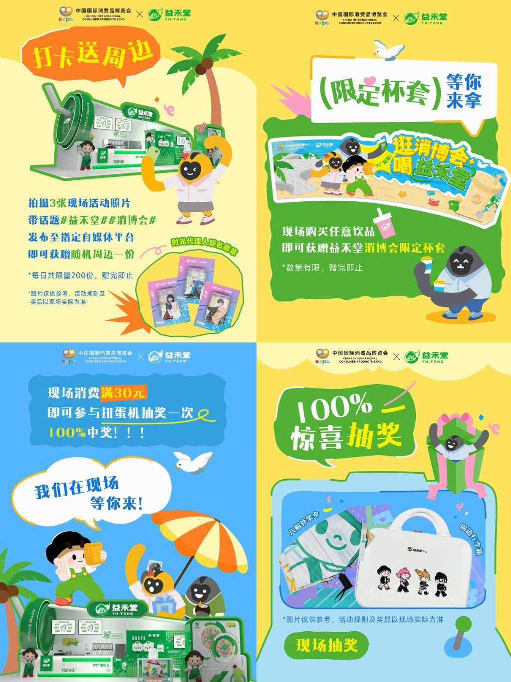 为强化"与年轻消费者互动"的定位,益禾堂在活动期间推出两大核心玩法:消费者拍摄3张现场照片带话题#逛消博会喝益禾堂#发布社交平台,即可获赠限量周边每日200份的限量机制引发打卡热潮;消费满30元参与扭蛋抽奖的设计,通过mini行李箱、联名杯具、堂堂帆布包等多款潮品制造持续惊喜;特别定制的消博会联名杯套更成为社交平台晒单焦点。这些精心设计的触点,将品牌主张转化为可感知的消费体验,成为展会现场最具辨识度的社交货币。