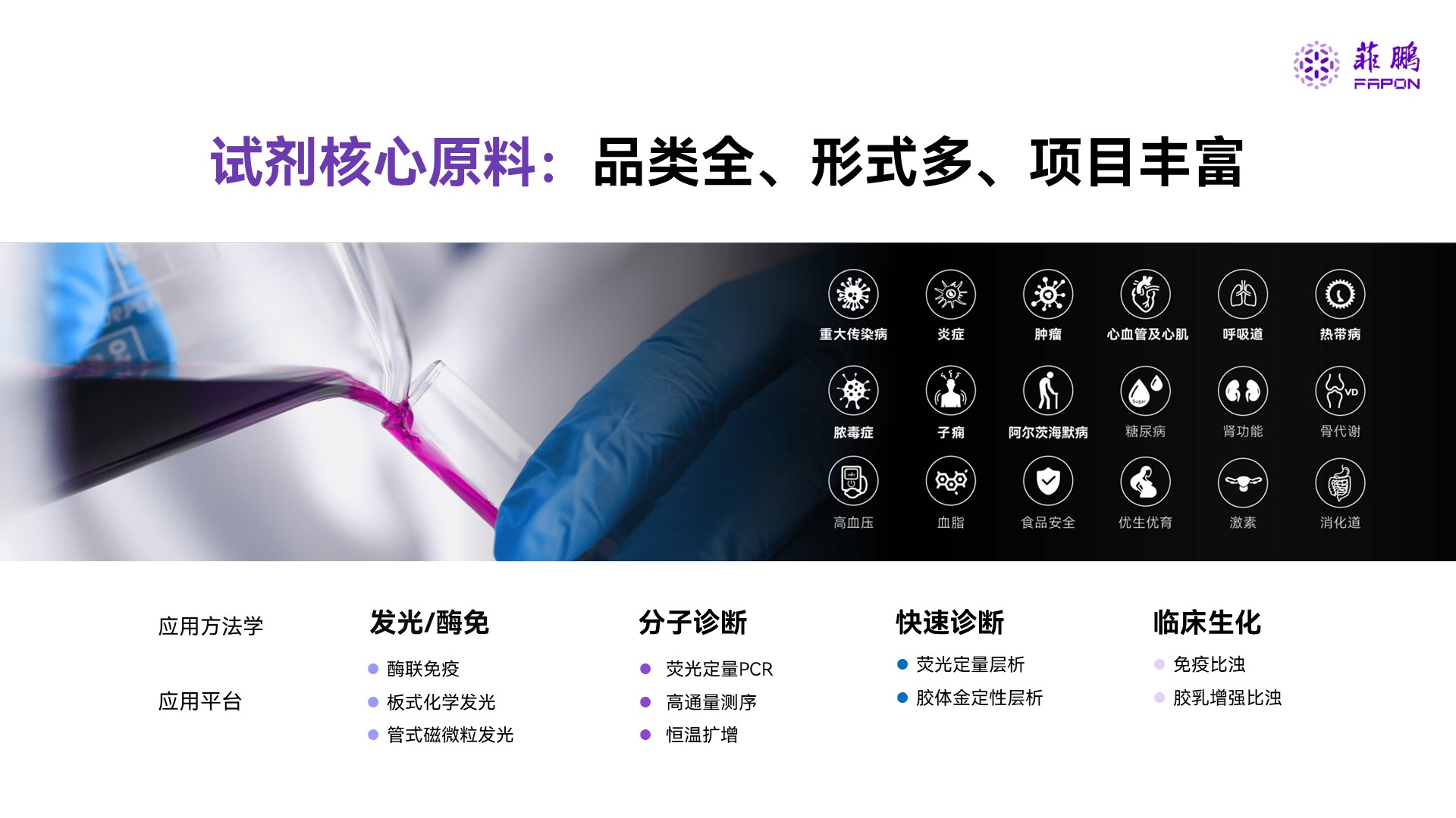 菲鹏生物自2001年成立以来一直深耕IVD领域,不断攻克关键原料技术、促进关键原料的国产化进程,打破外资品牌在上游诊断原料领域长期以来的垄断地位,并逐步构建了“开放仪器平台+试剂解决方案+试剂核心原料”的IVD一站式解决方案。在此次国际贸易变局中备受影响的试剂核心原料领域,菲鹏生物可提供覆盖免疫、分子、生化等主流检测及开发平台的1,400余种抗原&抗体&诊断酶等核心原料产品,产品性能全面对标国际标准、且本地化自产可控。以阻断剂、心肌、炎症、传染病、呼吸道、热带病、分子酶等为代表的项目,菲鹏生物的原料产品性能优异、成本可控、可实现规模化替代,有力支持到客户提高供应链安全及降本增效。