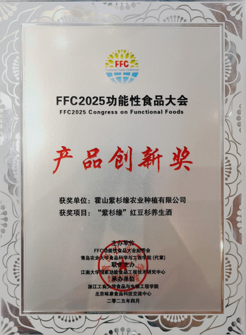 4月12日,FFC2025功能性食品大会在青岛盛大开幕,霍山紫杉缘农业种植有限公司凭借“紫杉缘”红豆杉养生酒摘得大会“产品创新奖”。在大会颁奖环节,公司总经理上台领取了“产品创新奖”证书。该奖项由FFC功能性食品大会组委会联合青岛农业大学食品科学与工程学院、江南大学国家功能食品工程技术研究中心等权威机构评选颁发,充分肯定了企业在功能食品领域的研发突破。