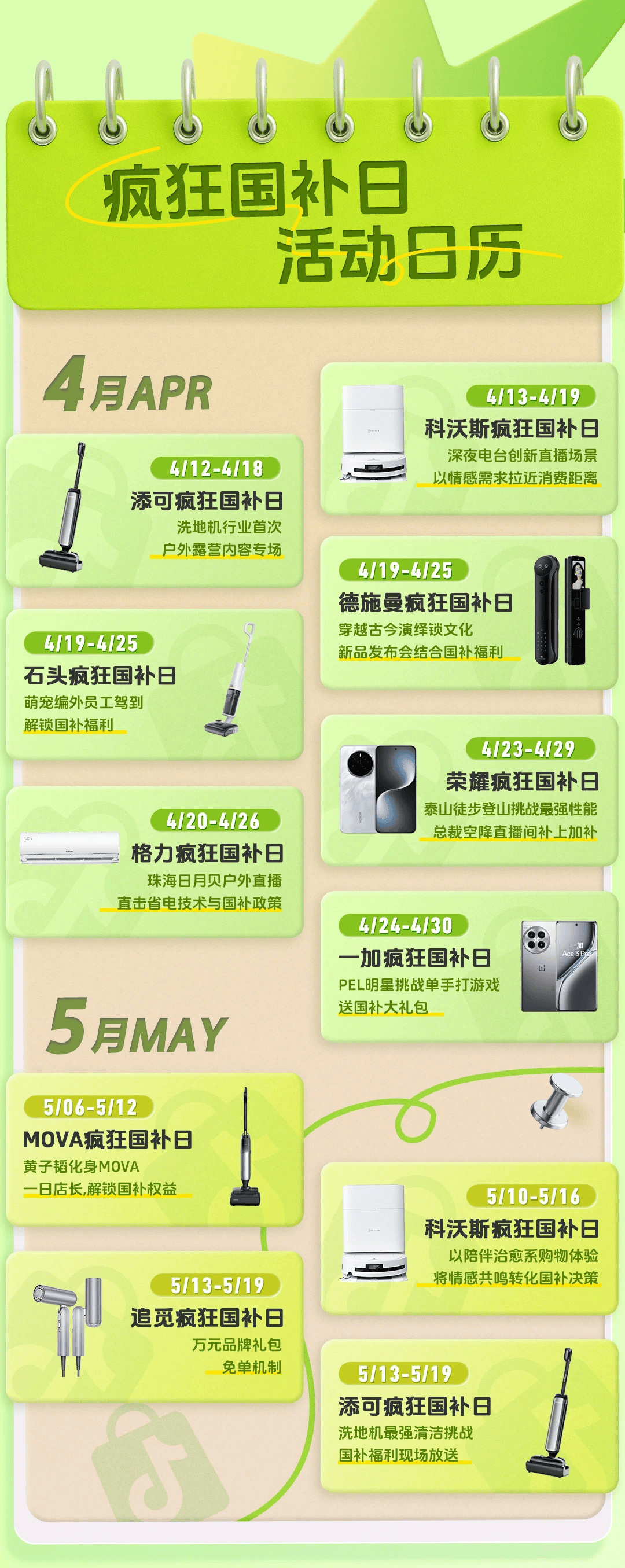 值得注意的是,4月、5月,“疯狂国补日”更将进一步加码升级,自4月18日起上线“每周五晚疯抢五折国补尖货”的疯狂限定玩法。消费者可以根据活动日历,在活动期间每周五晚打开抖音,进入品牌直播间或直接进入超值购频道,抢购低至五折的国补好物。