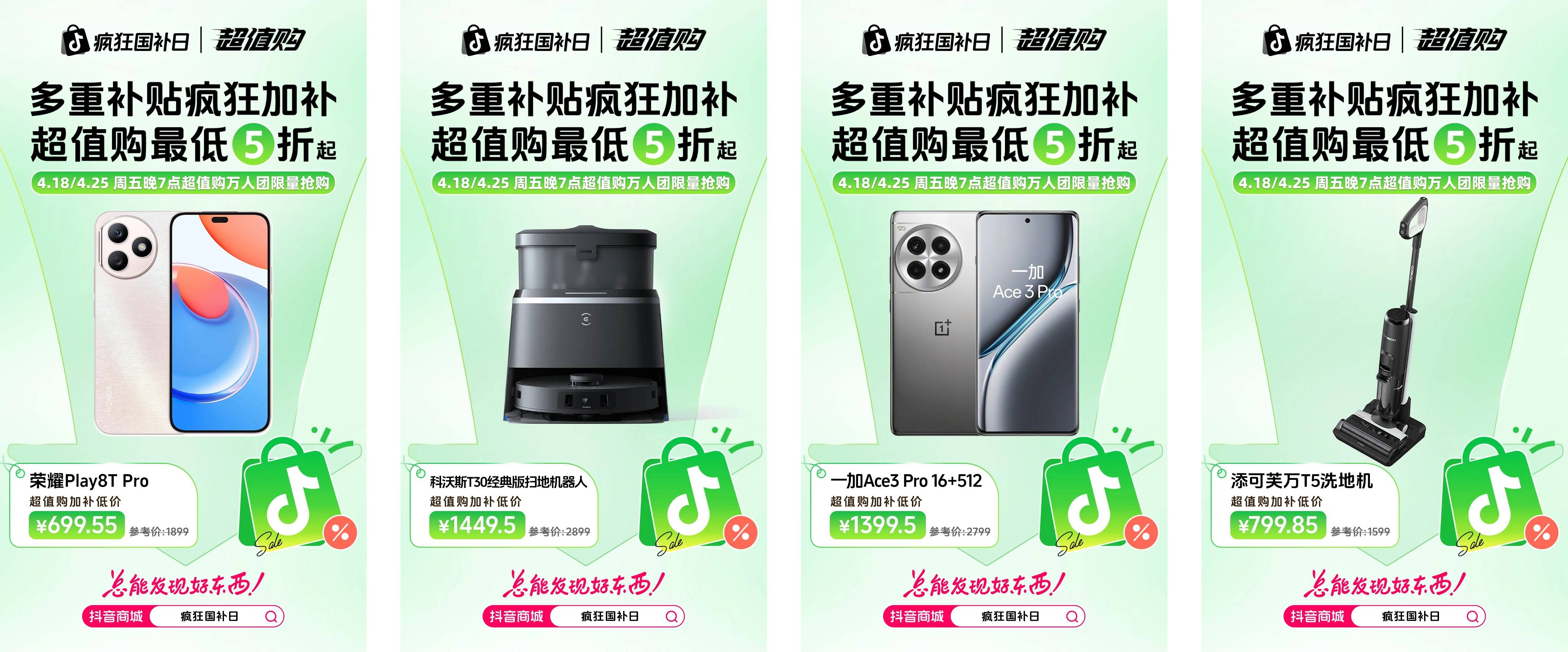 4月18日晚,不妨先人一步,首度开启“每周五晚疯抢国补五折”的全新体验玩法。趁着“疯狂国补日”,上抖音商城享疯狂国补,正在此刻。