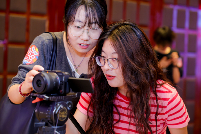 同学们积极试用了最新发布的创意视频机EOS R50 V、随身视频机PowerShot V1、强者全画幅专微相机EOS R5 Mark II以及3D VR镜头等产品,不仅体验到了照片拍摄的乐趣,还尝试了短视频带来的无尽创意。