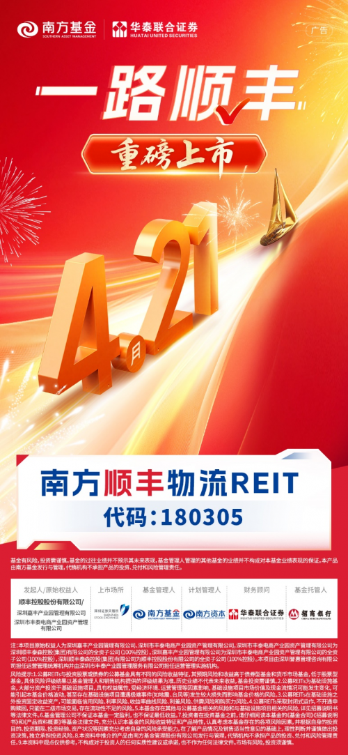 4月21日,由顺丰控股股份有限公司、华泰联合证券有限责任公司与南方基金管理股份有限公司多方携手合作的南方顺丰仓储物流封闭式基础设施证券投资基金(简称:南方顺丰物流REIT,代码:180305)于深圳证券交易所正式上市。