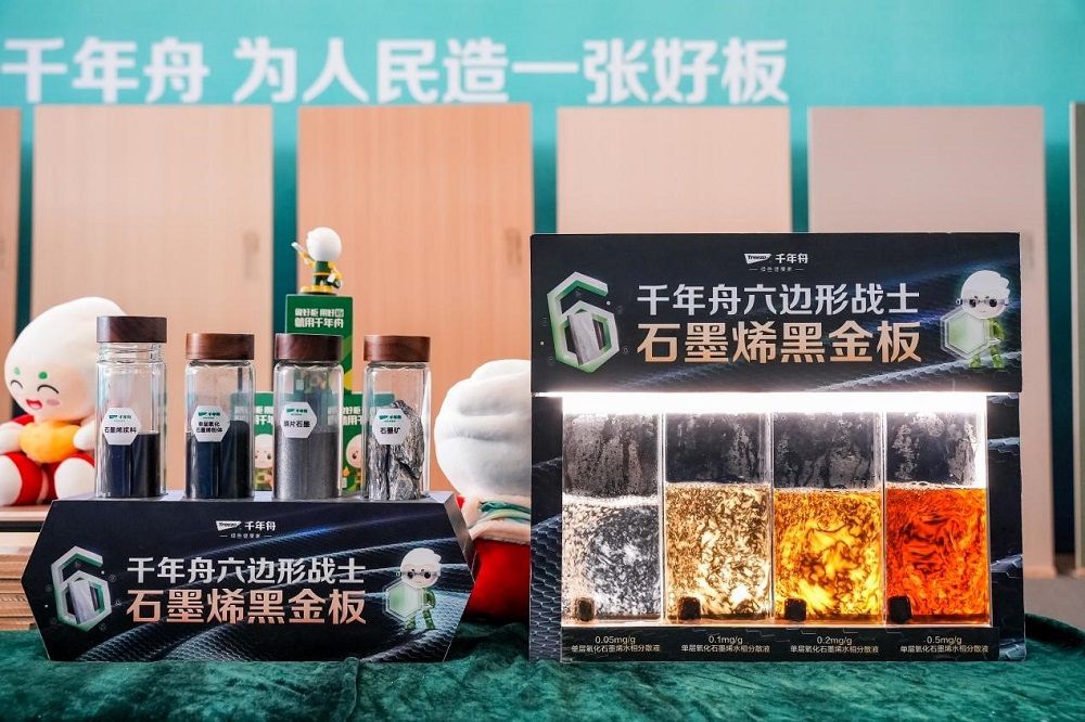 其中,“六边形战士”石墨烯黑金板作为千年舟与浙江大学高烯团队联合研发的重磅力作,凭借石墨烯材料在抗菌抗病毒、防霉、净醛、除TVOC等方面的特性,打造出真正意义上的“健康功能板”。其基板采用千年舟日照工厂自产的全松木板材,全面实现环保性能与功能拓展的双重跃升,代表了千年舟在绿色科技应用上的前沿探索。