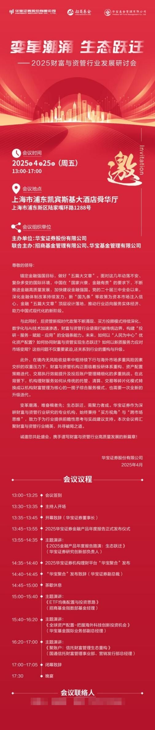 变革潮涌 生态跃迁。4月25日,华宝证券2025财富与资管行业发展研讨会,诚邀您共赴这场思想盛宴,携手探索财富与资管行业生态跃迁的新未来!