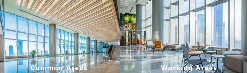 空间的温度:为营造舒适的办公环境,空间环境管理是健康建筑实践的另一大亮点。越秀商管通过降噪材料,结合空间声场优化技术,将办公空间噪音控制在舒适分贝;包括广州IFC、广州ICC在内的多个写字楼建筑采用中空双银LOW-E玻璃幕墙,除可阻挡70%紫外线外,还可根据时间段实现不同照度,保护租户视力健康的同时节约能源约40-60%。