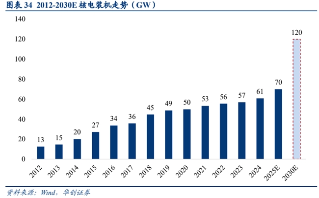 2019 年起我国核电机组重启审批,核电核准提速。长期看核电“量增”潜力更大。核电受地理因素制约较少,且第三代核电机组安全保障性显著提升,未来装机量提升空间广阔。按照中国核能行业协会预计,到2030 年核电在运装机容量可达到 120GW,截至 2024 年核电累计装机为 61GW,意味着在 2025 到 2030 的 6 年中需要完成 59GW 的新增核电装机,即到 2030 年之前每年需要新增 10GW,按照核电单台 1GW 来计算,大约一年需要新增 10 台核电机组,预计在未来的一段时间核电资本开支仍将向上。