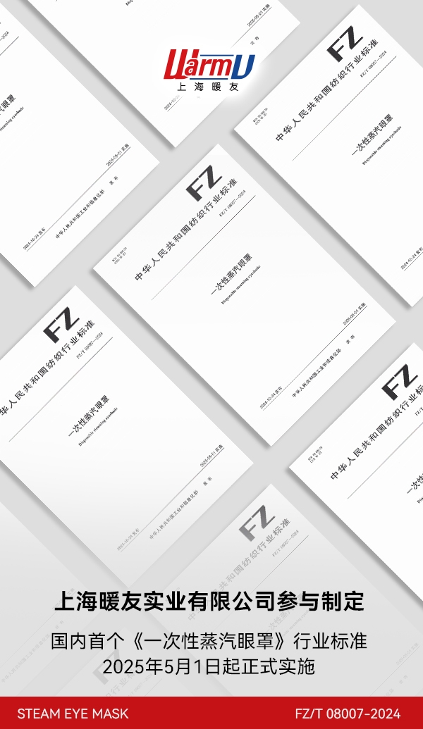 近日,由中华人民共和国工业和信息化部发布的首个一次性蒸汽眼罩行业标准FZ/T 08007-2024正式发布,并于2025年5月1日起全面实施。该标准由上海市质量监督检验技术研究院、上海暖友实业有限公司等二十余家单位联合起草。