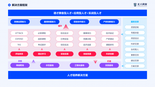 产品架构上,采用了“功能型应用”插嵌在“引擎”底座上进行交付的平台化架构,支持按需组合,更灵活、易维护,解决网安教学中应用和内容更新困难问题;仿真能力上,该体系突破传统靶场功能的仿真局限,可实现全栈网络协议仿真,提供接近真实的教学与训练场景,解决理论与实战断层问题;评估体系上,以TKS(任务、知识、技能)评估框架为理论牵引,将各教学环节融为有机整体,形成贯穿式的评估数据流,解决教学效果评估、学员能力匹配度评估难题;创新技术上,紧跟技术前沿,无论是教学工具还是课程,实现AI全面赋能,以应对AI大背景下网络安全专业人才培养的新变化;交付方式上,提供单服务器、集群标准和SaaS云等多元化交付模式,以满足不同预算的用户快速交付的需求。