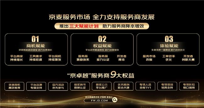 在本次大会上,京东还正式发布了“服务商赋能计划”,以商机赋能、权益赋能、体验赋能三大核心维度为着力点,为服务商提供精准商机匹配、九大权益支持、激活生意场景等全方位的服务支撑。