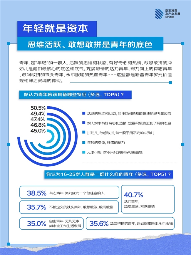 -新晋青年们认为年轻(状态)就是资本。无关年龄,超九成新晋青年认为自己当下状态是青年。活跃的思维和状态(50.5%)、有好奇心和热情(49.4%)、敢想敢拼的冲劲儿(47.4%)是新晋青年最核心的底色和底气。