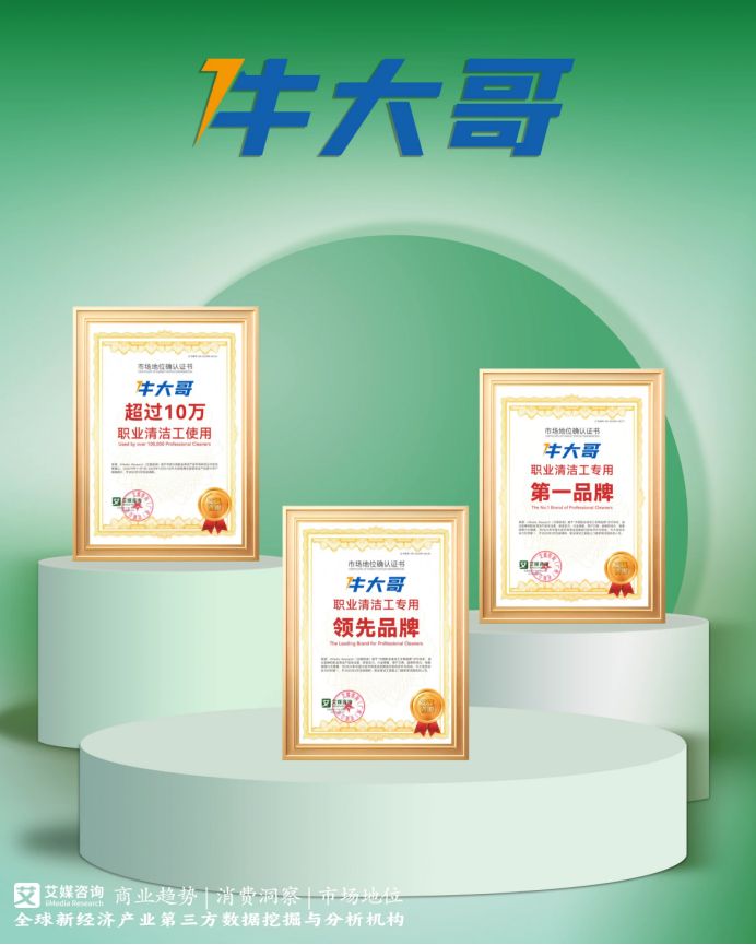 2025年4月,牛大哥获全球领先的新经济产业第三方数据挖掘和分析机构iiMedia Research(艾媒咨询)授予的“职业清洁工专用第一品牌”“职业清洁工专用领先品牌”“超过10万职业清洁工使用”三项市场地位确认。