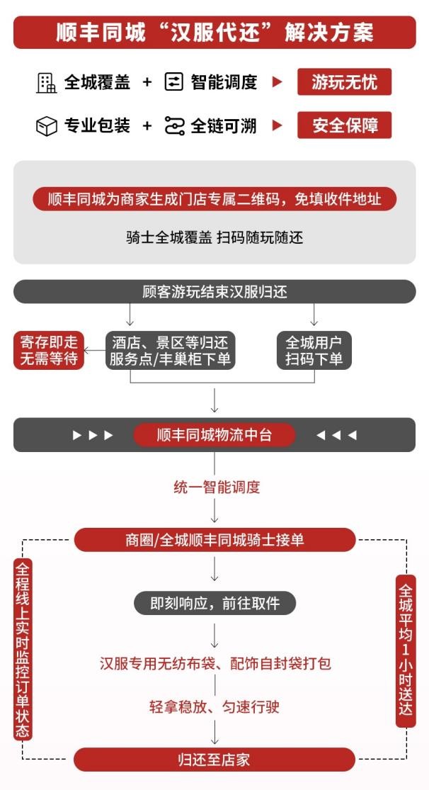 然而,在汉服体验结束后,归还汉服时,游客常常面临门店位置难找、往返交通耗时、费用高昂等不便。基于此,顺丰同城已在西安等地推出的“汉服代还”解决方案,通过优化骑士覆盖、汉服包装等关键环节,游客扫码下单,即可享受“全城平均1小时归还”的便捷服务。