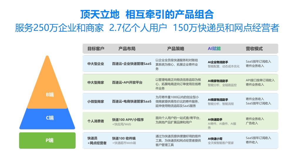 围绕不同客户群体的需求,「百递云」构建了层次分明、功能完备的产品矩阵。