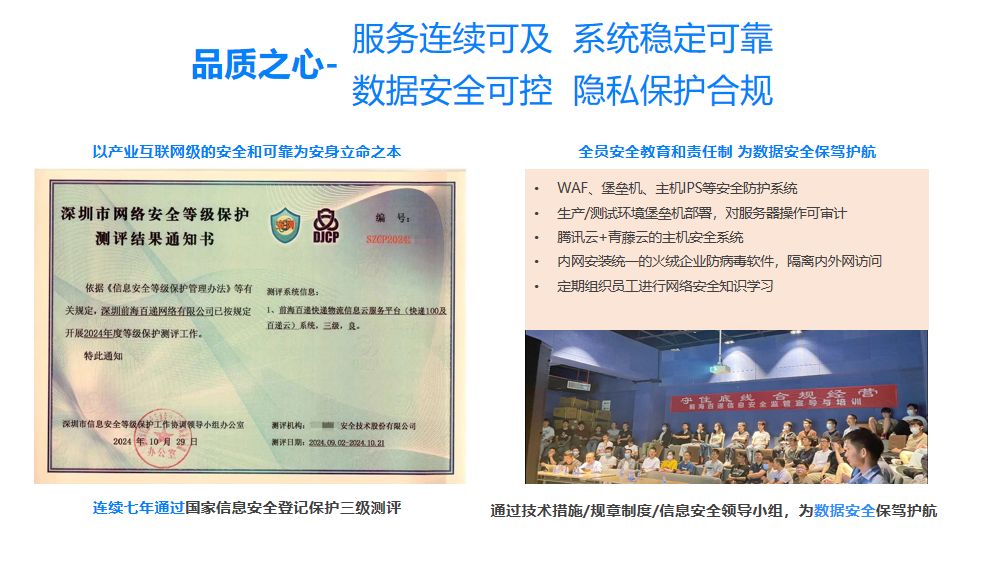 2024年在 10 月 29 日,快递100成功通过“国家信息系统安全等级保护三级测评”,且这已是自 2018 年起连续第七年通过该测评。这一系列的努力和成果,彰显了快递 100 对技术探索的执着追求和对用户数据安全的高度责任感,为用户提供安全可靠的快递服务体验奠定了坚实基础,也为其未来的发展提供了有力保障。